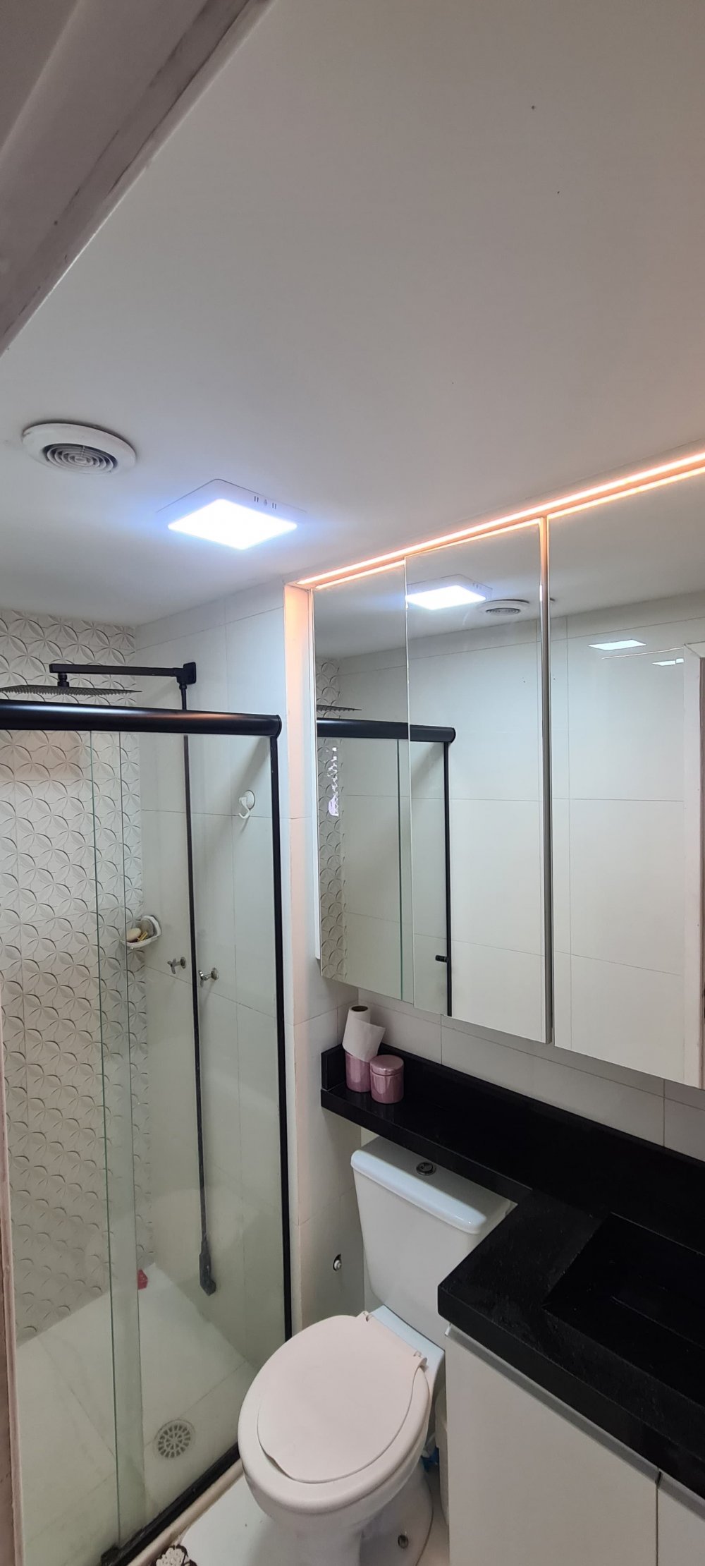 Na cozinha a pia e bancada em petróleo negresco. Banheiro tbm com pedra e armário planejado.