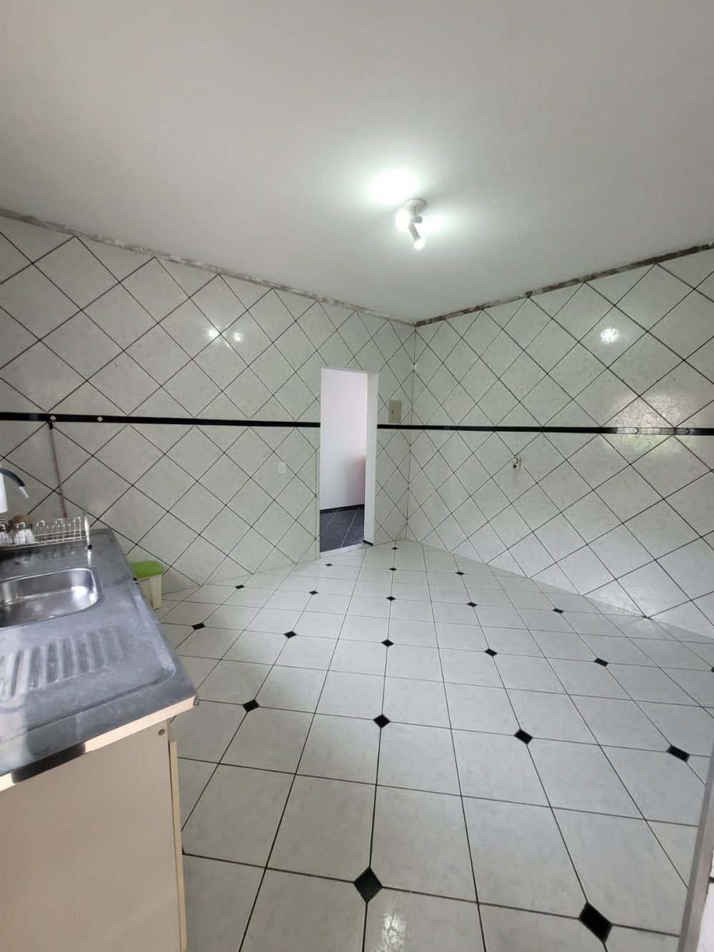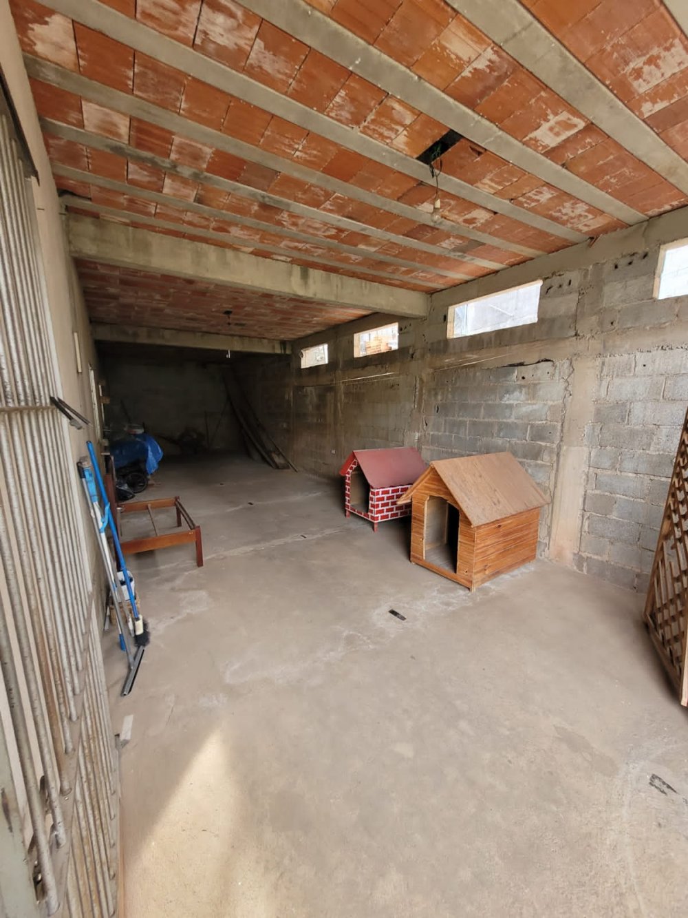 A garagem é descoberta com portão basculante (sem motor) e portão social.